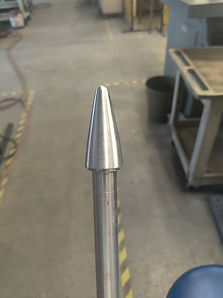 The process for manufacturing the nose cone tip started with cutting a solid aluminum rod of diameter 1.5in to ~3.5in in length. Then the back end of the nose tip is lathed. Once that is done, the threads are dyed into the back. In order to lathe the cone shaped tip and preserve the threads, a tapped rod is screwed onto the threads. This rod is used like a handle to hold parts as its lathed. Finally the parts is sanded down to smooth the shape.